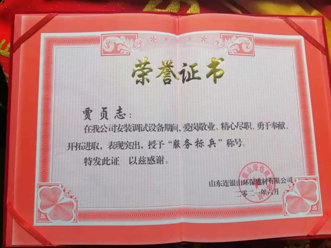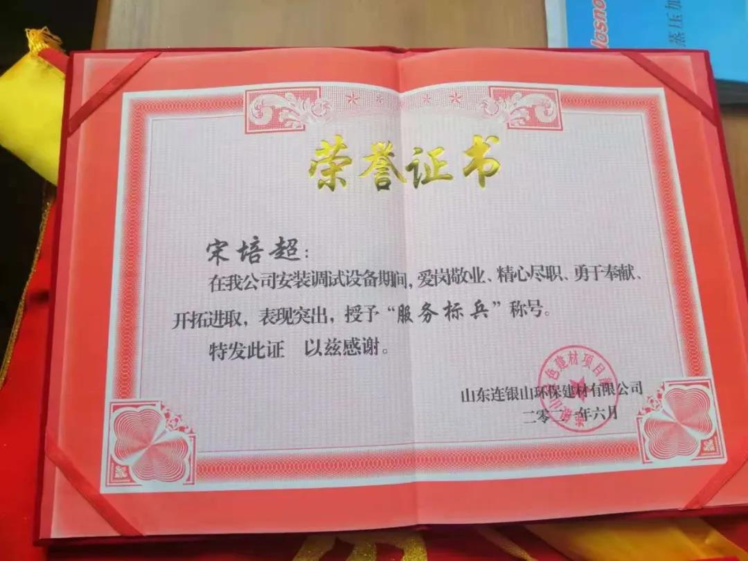 炎炎夏日,天意機(jī)械在向客戶山東連銀山環(huán)保建材有限公司售出保溫裝飾一體化板生產(chǎn)線之后,隨即派出售后團(tuán)隊(duì)對(duì)設(shè)備進(jìn)行安裝調(diào)試及售后培訓(xùn)。售后團(tuán)隊(duì)不畏酷暑,精心、耐心、專業(yè)地為客戶進(jìn)行安裝調(diào)試,贏得了客戶的好評(píng)和認(rèn)可,客戶為表達(dá)謝意,特授予天意機(jī)械售后人員榮譽(yù)證書和錦旗,以表彰售后人員愛崗敬業(yè)、精心盡職、勇于奉獻(xiàn)、開拓進(jìn)取的精神。