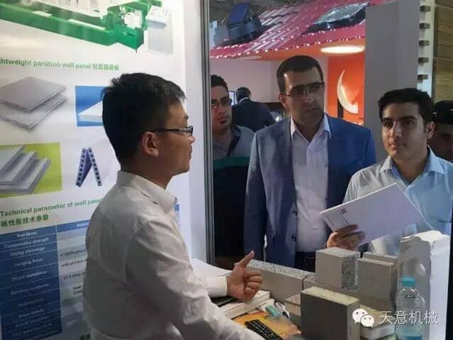 展會上,天意機(jī)械銷售經(jīng)理劉春剛細(xì)心的向前來咨詢的客戶,介紹了天意綠色建筑建材裝備在建筑行業(yè)內(nèi)的應(yīng)用優(yōu)勢,通過觀看產(chǎn)品應(yīng)用視頻以及展現(xiàn)成品樣塊,使得天意展位前門庭若市。期間,外貿(mào)部銷售經(jīng)理劉春剛,專程拜訪了天意公司在伊朗年產(chǎn)50萬平方的輕質(zhì)墻板生產(chǎn)線合作伙伴。詳細(xì)了解客戶的生產(chǎn)情況,幫助客戶免費(fèi)升級技術(shù)配方降低成本。
