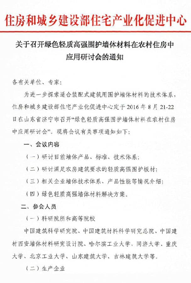 為進一步探索適合裝配式建筑用圍護墻體材料的技術體系,住房和城鄉(xiāng)建設部住宅產(chǎn)業(yè)化促進中心定于2016年8月21-22日在山東濟寧市兗州區(qū)召開“綠色輕質(zhì)高強圍護墻體材料在農(nóng)村住房中應用研討會”。
