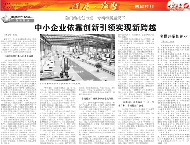 2015年1月25日的大眾日?qǐng)?bào)?兩會(huì)特刊《獨(dú)門絕技創(chuàng)市場(chǎng) 專精特新贏天下――中小企業(yè)依靠創(chuàng)新引領(lǐng)實(shí)現(xiàn)新跨越》重點(diǎn)介紹了我公司技術(shù)創(chuàng)新的經(jīng)驗(yàn),敬請(qǐng)關(guān)注。