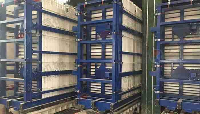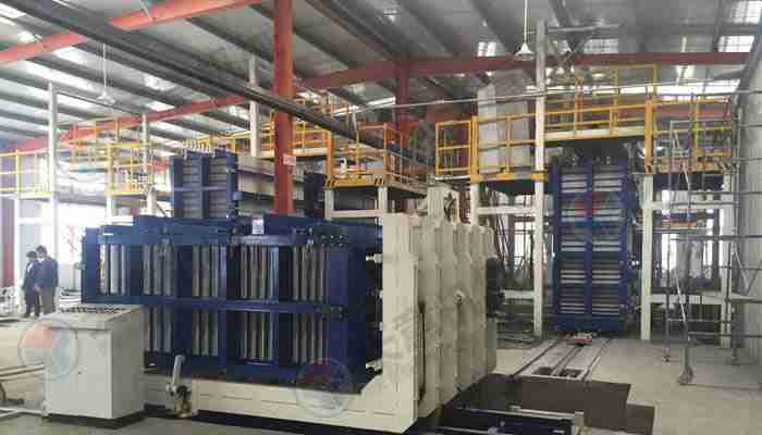 該復(fù)合墻板生產(chǎn)線立式旋轉(zhuǎn)臥式出板復(fù)合墻板成型機(jī),一次可生產(chǎn)四十塊墻板,該生產(chǎn)線主要分為:配料攪拌系統(tǒng)、墻板成型系統(tǒng)、液壓整體開模系統(tǒng)、液壓翻轉(zhuǎn)系統(tǒng)、整體出板翻轉(zhuǎn)碼垛系統(tǒng)、成型機(jī)自動(dòng)循環(huán)系統(tǒng)、變頻擺渡系統(tǒng)、數(shù)控配電系統(tǒng)等部件 組成。該生產(chǎn)線自動(dòng)化程度高,液壓開合模,解決了傳統(tǒng)立式復(fù)合墻板機(jī)人工開合安全隱患,提高了工作效率。設(shè)備配有整體出板碼垛系統(tǒng),解決了傳統(tǒng)人工出板方式,減少產(chǎn)品的破損率,提高了產(chǎn)能。生產(chǎn)線使用密封式泵送系統(tǒng)配備雙工位注漿槍,注漿速度快密實(shí)度高,材料粘結(jié)更緊密。
