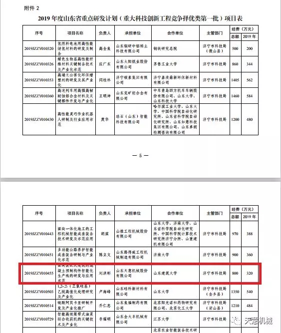 天意機(jī)械面向裝配式建筑的混凝土預(yù)制構(gòu)件智能化生產(chǎn)線的研發(fā)與應(yīng)用項(xiàng)目列入2019年山東省重點(diǎn)研發(fā)計(jì)劃,總計(jì)資金支持800萬(wàn)元。